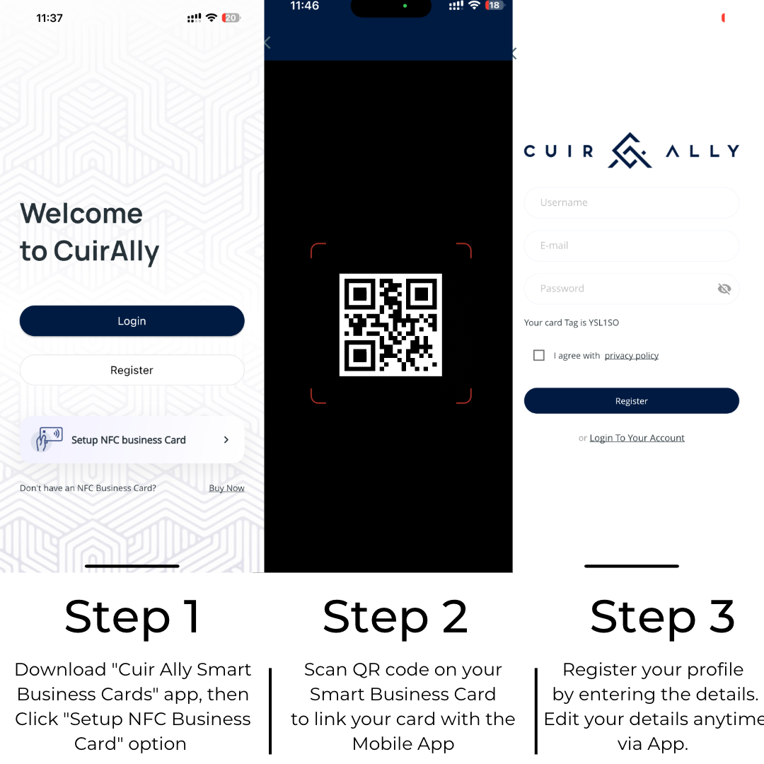 - One-time easy 5min profile setup using our "Cuir Ally Smart Business cards" mobile app